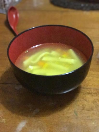 In continuing the story of the soup, I added some frozen turkey bits from a previously roasted turkey, some carrots, and yellow pepper to the broth about half an hour before my wife was going to be home. Normally I wouldn’t have added them so early, but let’s be clear here–sick people do not love crunchy vegetables. Softer carrots and softer peppers are good for the throat, especially as the pepper oils spread into the broth and slowly condition my youngest child to like the taste of peppers–I will win the pepper-war eventually. When my wife walked in the door, the slightly dried noodles were tossed in the pot. In a few minutes (far less time required than when cooking dried noodles), the soup was ladled out to salivating kids. A prayer, a blessing, and sore throats began to enjoy.