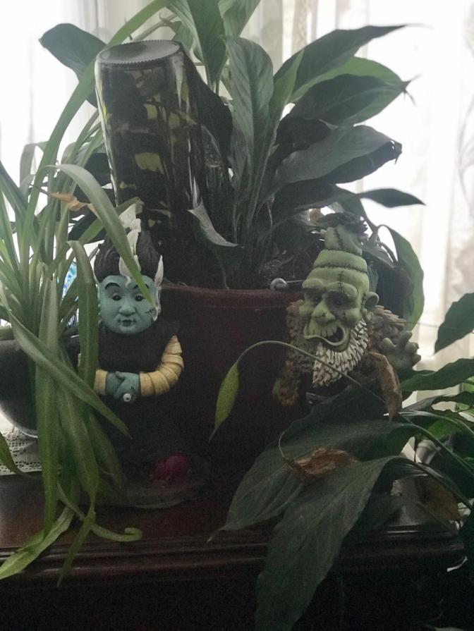 Two of my favorite garden gnomes sit right next to the computer desk in our “library.”