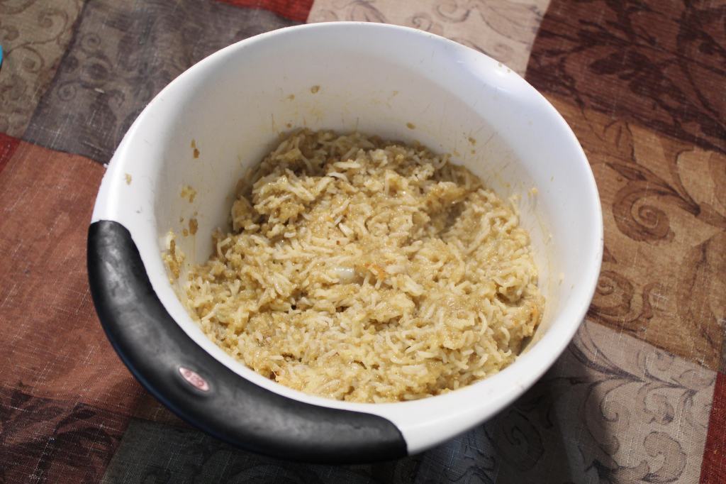 First, make the noodles. On a clean surface, like a large rolling board or a silicone rolling mat, sift the flour and salt together. Make a well in the flour. Crack the eggs into the well. Work the eggs through the flour, which is surprisingly easier if you do it before you add the water. When thoroughly mixed, form another well and add the water. At this point, I use a spatula to make sure the water doesn’t escape until the dough is formed. Roll the dough as flat as possible and cut into the desired shape. Kluskis are usually about 2 inches long and maybe a half centimeter wide. I didn’t do a very good job at this part, but they still tasted good.